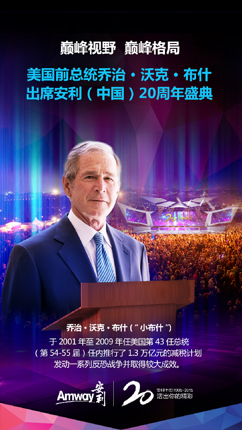 2015,适逢安利(中国)20 周年。为庆祝公司20 年来的辉煌成就,8 月1 日晚,公司将在广州国际体育演艺中心隆重举办20 周年盛典“活出精彩”。这将是回顾公司20 年来的精彩历程,感恩广大伙伴和员工二十年来与公司风雨同舟荣辱与共的辉煌之夜,亦将是展现公司雄厚实力,一起展望下一个美好十年的未来之夜!除了惊艳舞美和演艺巨星带来的极致感官盛宴,更值得期待的是,美国前总统乔治·沃克·布什(“小布什”)亦会作为此次庆典的重磅级嘉宾亮相盛会,为伙伴们带来巅峰视野,巅峰格局。