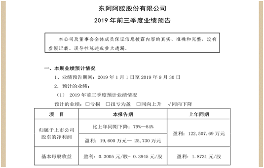 10月14日晚间,东阿阿胶股份有限公司(以下简称“东阿阿胶”)发布《2019年前三季度业绩预告》,预计2019年前三季度实现的净利润为1.96亿元-2.57亿元,同比下降79%-84%。对于业绩变动原因,东阿阿胶表示,当前,公司正处于调整期,受整体宏观环境以及市场对价值回归预期逐渐降低等因素影响,公司主动压缩渠道客户库存并控制发货,从而对经营业绩产生一定影响。