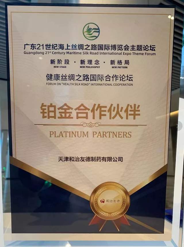 鉴于天津和治友德制药有限公司作为全球大健康产业知名企业,在抗击新冠疫情期间践行责任、爱心奉献,以及多年来为“弘扬养生文化造福人类健康”所作的贡献,和治友德公司成为本次国际论坛的协办单位,并获颁铂金合作伙伴奖牌。
