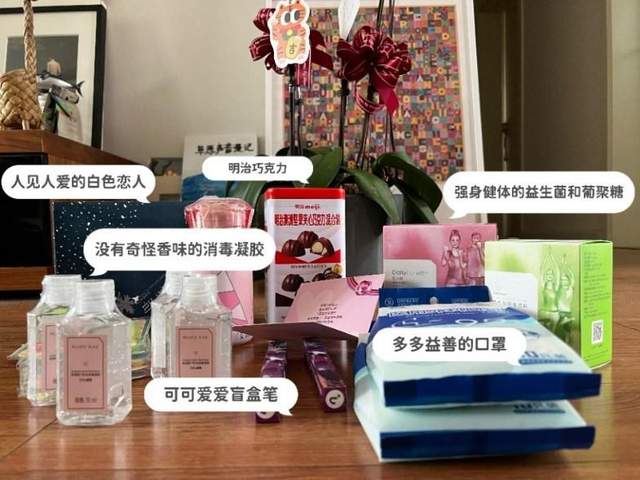 没过几天,每个员工的家里就陆续送来了第一个特殊时期关怀礼盒。打开快递箱,一张印有“见字如晤”的卡片引入眼帘,卡片下面则满满当当放着白色恋人饼干、明治巧克力等零食,给小朋友的盲盒笔,给大朋友的计数绳,还有口罩、消毒洗手液、葡聚糖和益生菌等防疫用品,看起来十分温情。