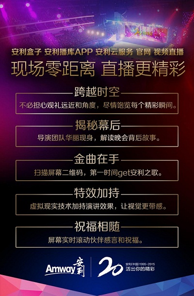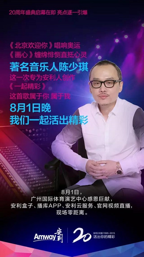 8月1日晚安利(中国)20周年盛典上,安利专属之歌——《一起精彩》将新鲜出炉!作为此次盛典最大的亮点之一,《一起精彩》由香港著名音乐人陈少琪作词,香港无线电视台TVB著名音乐人叶肇中谱曲,并由“金曲歌王”萧敬腾倾情演绎(因档期原因萧敬腾不能亲临现场,将通过MV视频献唱),9月起《一起精彩》更将在全国KTV上线,成为大众热传的正能量金曲。强强联手,倾力打造!三位重磅级音乐人的碰撞会带来怎样的音乐盛宴?敬请期待。