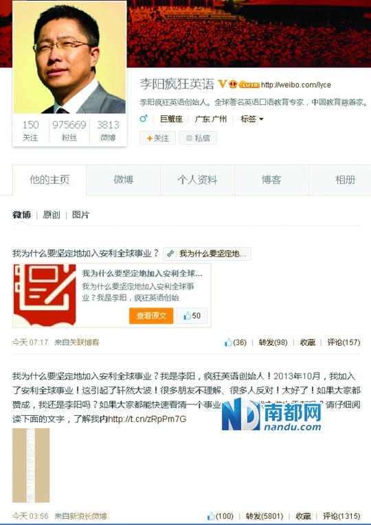 11月4日凌晨4时,疯狂英语创始人李阳发了一条长微博,证实自己加入安利。在1431字的长微博里,李阳用了79个感叹号,一如他演讲时的亢奋。他称自己“找到了灵魂的归宿”,安利的人才是“令人感动、不离不弃的真朋友”,并且用了安利产品后,“和美国太太的关系亲密了”。