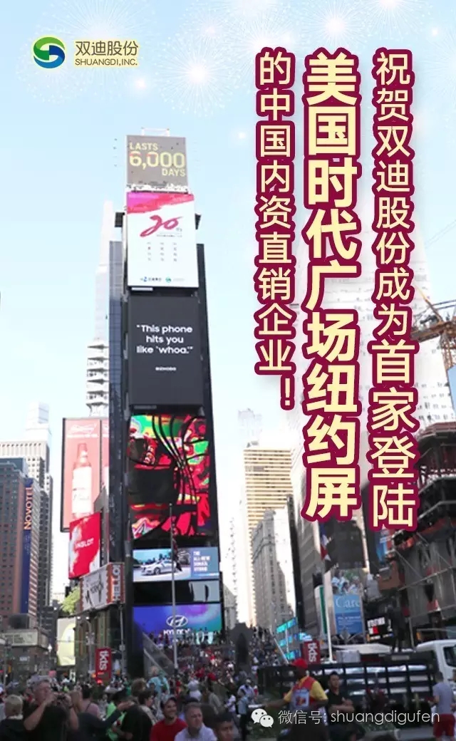 在举国欢庆中秋佳节和天宫二号成功发射之际,美国纽约当地时间9月16日上午,庆祝珍奥双迪事业20周年形象广告片亮相纽约时代广场大屏幕,双迪股份高调亮相全球中心——美国纽约时代广场最黄金的路透户外屏,成为第一家刷屏的中国内资直销企业。