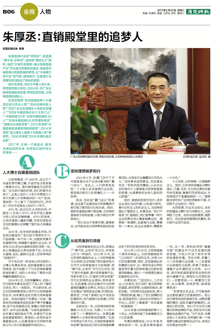 他叫朱厚丞,毕业于中国人民大学,获管理学博士学位,2004年,任广东太阳神集团副总经理、营销总部总裁,太阳神直销的创始人。