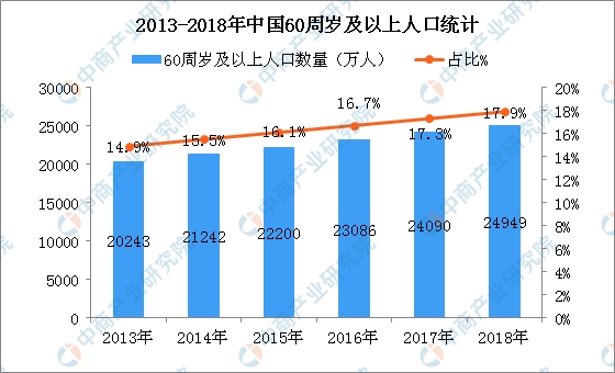 目前,中国已经成为世界上老年人口最多的国家,据国家统计局最新数据,近几年,中国60岁以上老年人口数量不断增长,2013年突破2亿,占比仅14.9%,2017年达到24090万人,占比突破17%。到2018年末60岁及以上人口为24949万人,占17.9%,其中,65岁及以上人口为16658万人,占11.9%。与2017年末相比,老年人口比重持续上升,其中,60岁及以上人口增加859万人,比重上升0.6个百分点;65岁及以上人口增加827万人,比重上升0.5个百分点,人口老龄化程度继续加深,未来中国老龄人口将进一步增加。