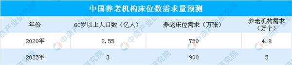 随着人口老龄化不断加剧,养老服务需求快递增长,养老机构成为老年人社会化养老的重要方式。预计我国2020年60岁以上人口数将达到2.55亿人,养老床位需求数达750万张,需求养老机构数约4.8万个。