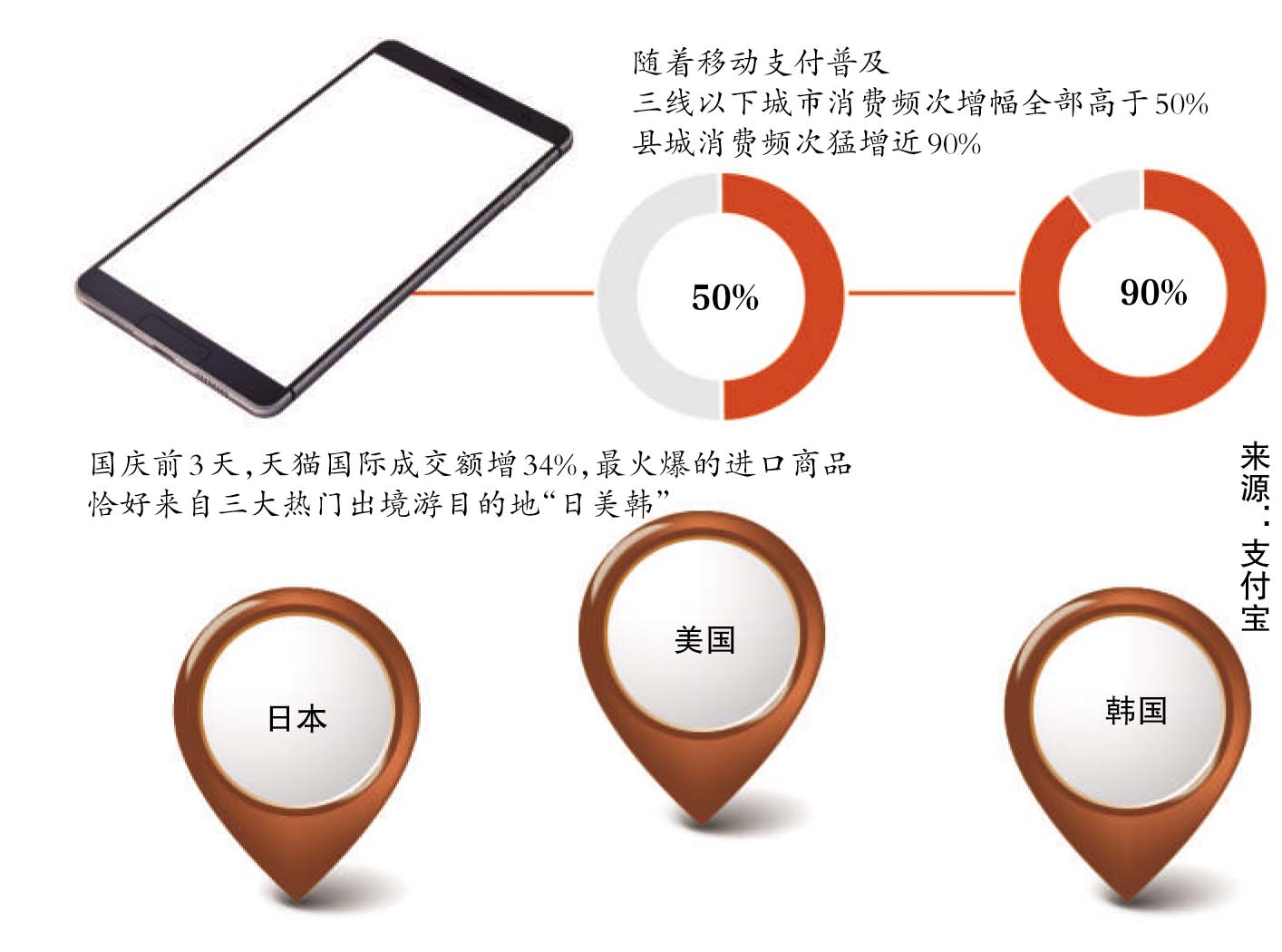 另据支付宝的数据显示,十一黄金周前三天,三线以下城市消费频次增幅均高于50%,县城消费频次更猛增近90%。