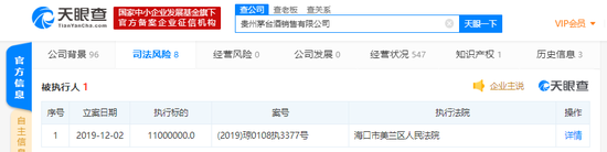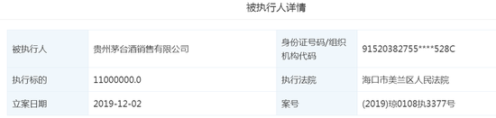 天眼查数据显示,12月2日,贵州茅台(1124.000, 6.00, 0.54%)酒销售有限公司被海口市美兰区人民法院列为被执行人,执行标的1100万元。