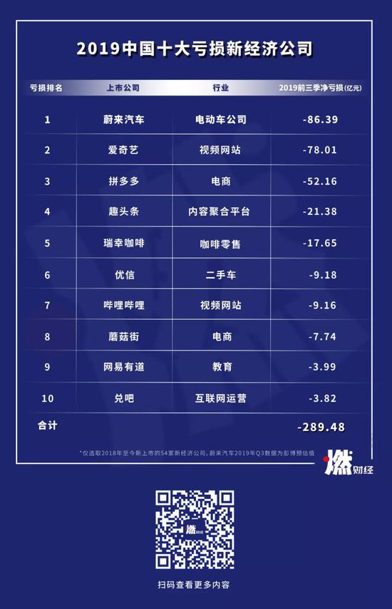 综合而言,10家新经济公司,在2019年前三季度合计净亏损289亿元。