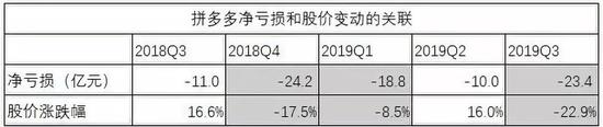 以拼多多为例。每一次发布财报,都会带来拼多多股价的大幅波动,焦点则在于净亏损。2018年Q4、2019年Q1、2019年Q3,这三个季度拼多多均出现较大幅度的亏损。与之相对应,拼多多的股价在财报发布当日均出现大幅下跌。相反,2018年Q2、2019年Q2,拼多多的净亏损缩窄,财报当天股价大幅上升。