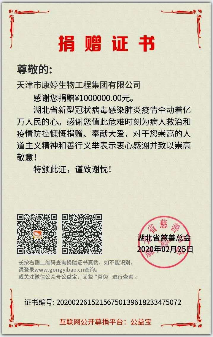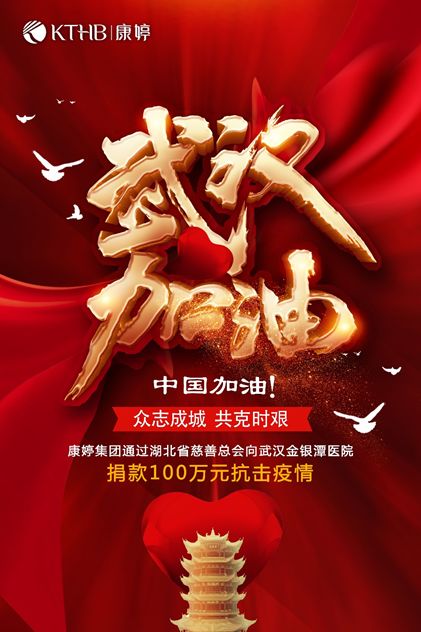 面对疫情,我们众志成城。在疫情防控的关键时刻,康婷集团主动承担社会责任,持续密切关注疫情,心系疫区,为疫情的防控工作提供力所能及的帮助。2月25日,康婷集团通过湖北省慈善总会向湖北省武汉市金银潭医院定向捐赠100万人民币,用于支持武汉抗击新型冠状病毒疫情的防控工作,携手同行并肩作战,为抗疫公益行事业贡献自己的一份力量。