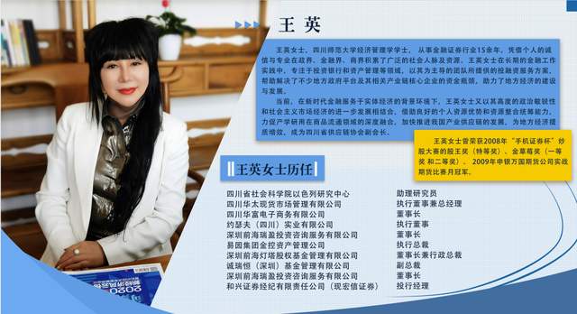 华太市场执行董事兼总经理王英女士从事金融证券行业15余年,专注于投资银行和资产管理等领域,以其为主导的团队所提供的投融资服务方案,帮助不少地方政府平台及其相关产业链核心企业解决了资金瓶颈,助力地方经济的建设与发展。个人曾荣获2008年“手机证券杯”炒股大赛股王奖(特等奖)、金草莓奖(一等奖和二等奖)、2009年申银万国期货公司实战期货比赛月冠军。此外,她还担任四川省供应链协会副会长。