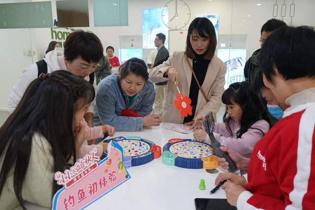 小朋友们与家长参与亲子嘉年华“钓鱼初体验”游戏