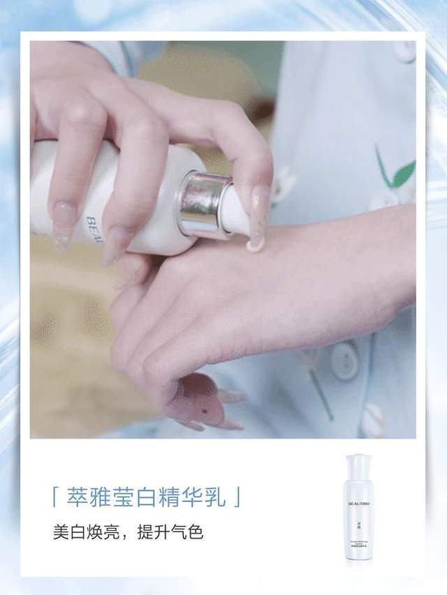 萃雅莹白精华乳:以乳润肤,轻薄乳液质地,拥有专利成分-花粹焕颜方[5],4种天然本草凝练复配,涂抹促进肌肤微循环,肌肤不假白,呈现自然好气色。