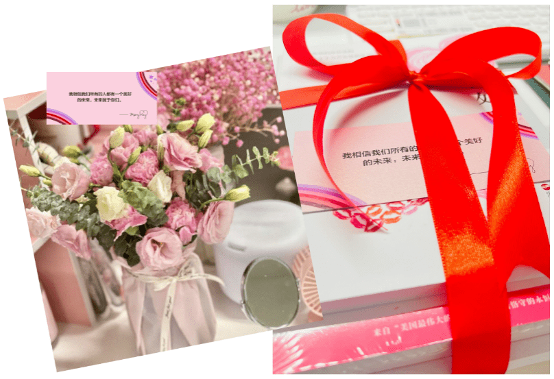 因为这已经不是第一个惊喜包裹了,再往前一周,她收到的是一份“沉甸甸”的期许——一套创始人玫琳凯女士的书籍和甜蜜的巧克力,打开包裹这句话就引入了眼帘:“未来属于你们。”